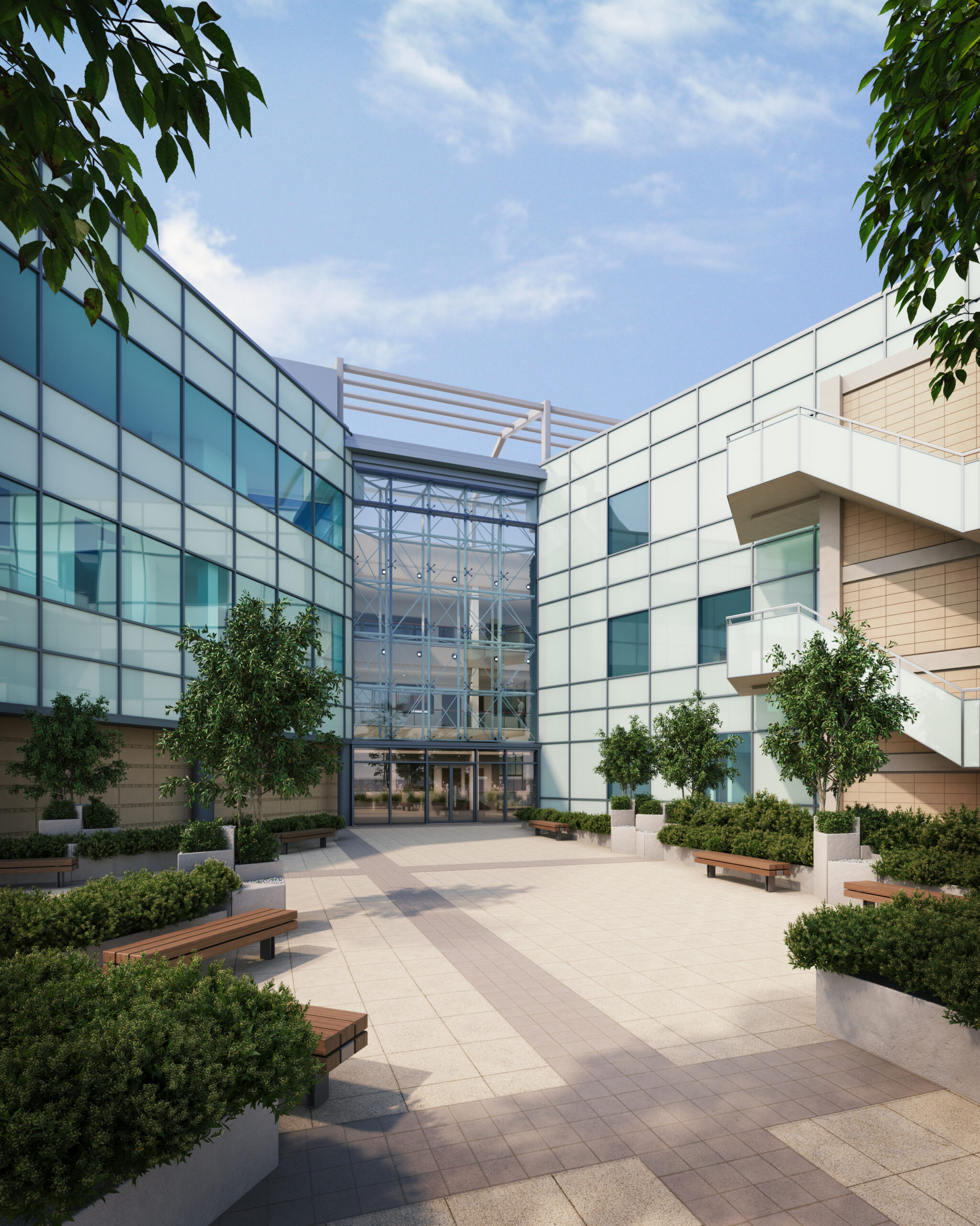 Architecture is organised around a central open‑air atrium, creating a light‑filled communal space that mirrors the character of the neighbouring parkland. This generous void draws daylight deep into the plan and lends a calm, open quality to everyday movement through the building.