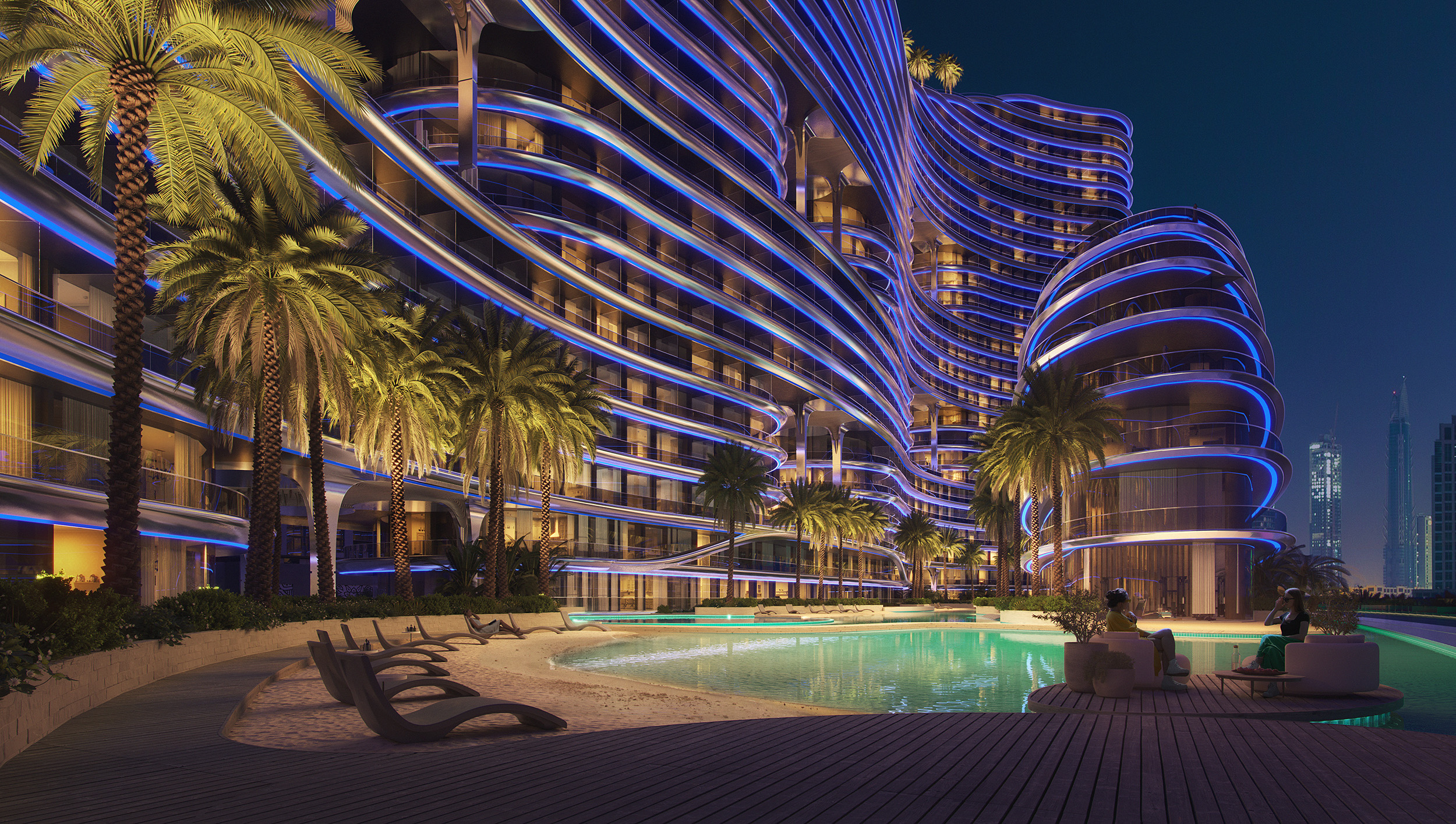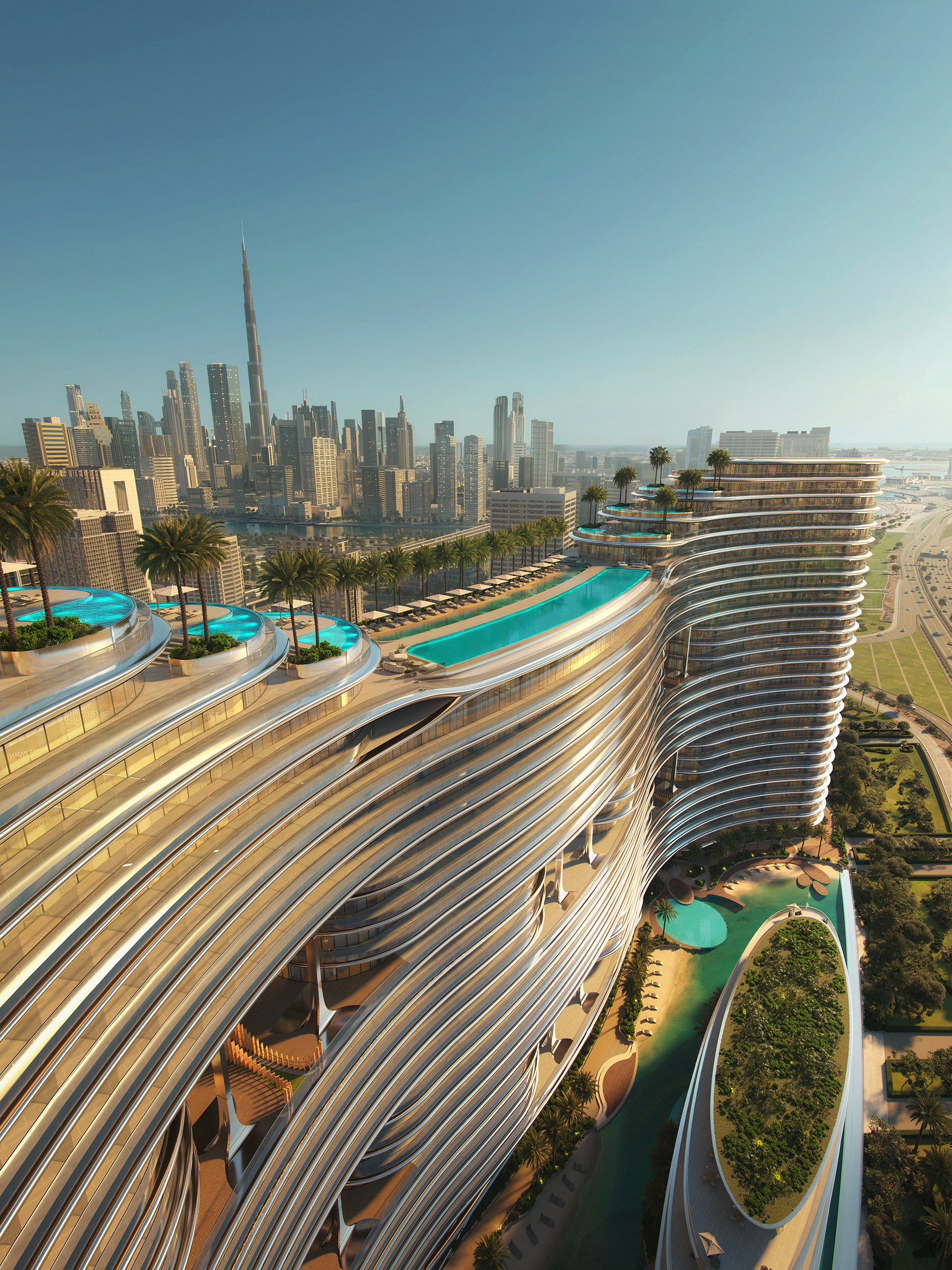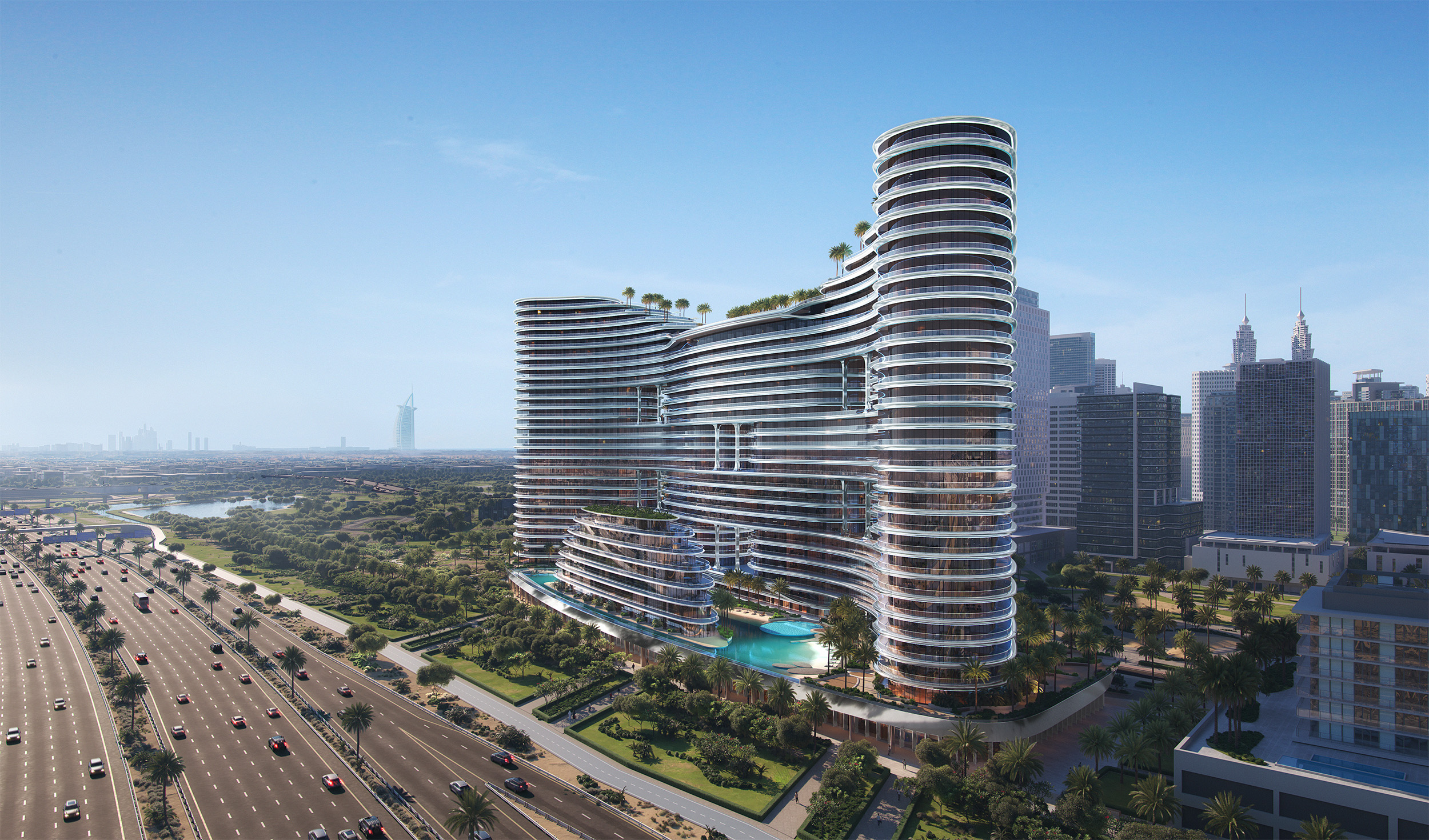 Aquarise is a fluid, sculptural tower in Business Bay, offering calm, design‑led city living.